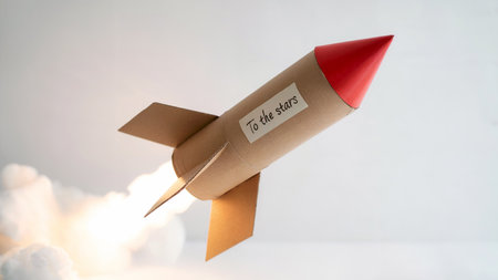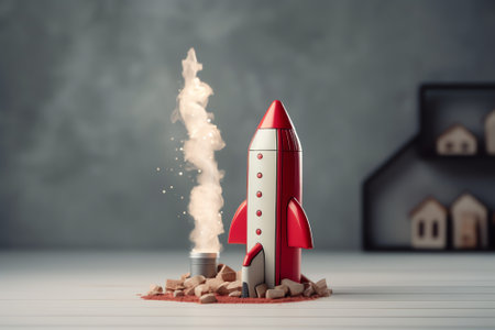 Creative idea for business development. Successful startup concept. Rocket launching at office workplace. Created with Generative AI