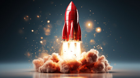 Rocket starts from abstract ground. Spaceship launch with fire and smoke. Concept of a successful start up of a business. Creative idea, education online. Ai Generative illustration