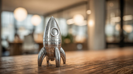 A sleek metallic miniature rocket sits atop a wooden surface, surrounded by contemporary office elements, embodying forward-thinking, proactive strategies, and startup ambitions.