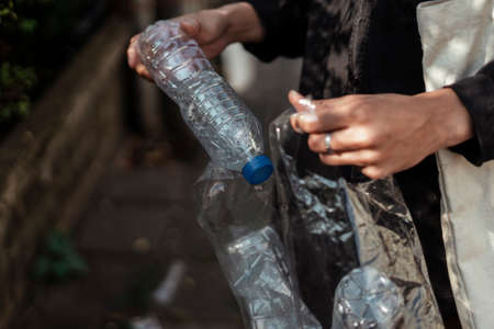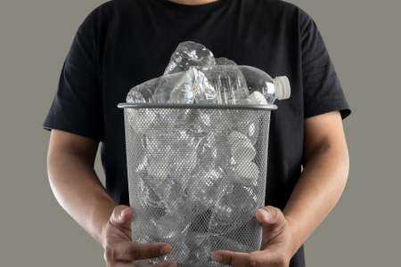 Cropped image of plastic bottle is collected by the man in black shirt.