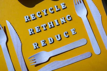 RECYCLE RETHING REDUCE text Wooden forks and paper cups with plates on color background. Eco friendly disposable tableware. Used in fast food, restaurants, takeaways, picnics. No plastic