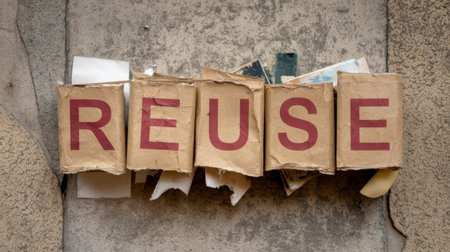 A creative sign reading Reuse crafted from weathered book pages, emphasizing the importance of sustainability and recycling in our daily lives. This artistic display encourages eco-friendly practices