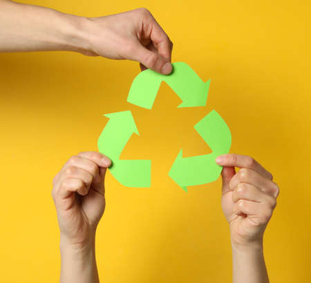 Hands holding recycle sign on yellow background, close up