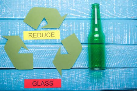 Recycle concept showing the green recycle logo with glass & reduce on a blue weathered background
