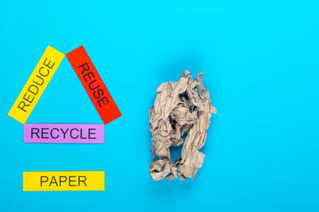Recycle concept showing reduce, reuse & recycle with paper on a blue background