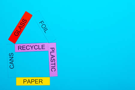 Recycle concept showing reduce, reuse, recycle and the recycle logo on a blue weathered background with paper