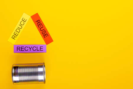 Recycling concept showing reduce, reuse & recycle with cans on a yellow background
