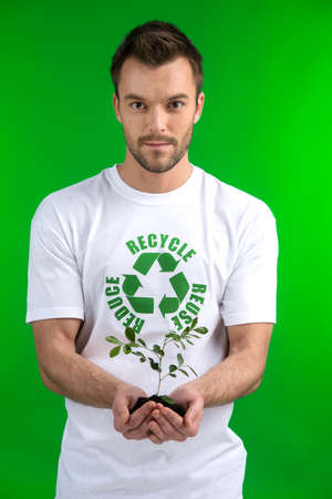 Man holding the earth with recycling symbol; Concept of global recycling