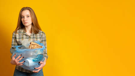 Banner. Waste sorting and sustainability concept - sad young woman holding plastic trash bag over yellow background.