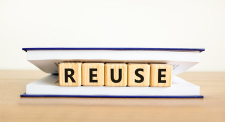 Reuse symbol. Concept word Reuse on beautiful wooden blocks in book. Beautiful wooden table white background. Business lifestyle ecological reuse concept. Copy space.