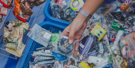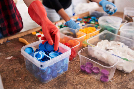 Man sorting plastic caps for the colors