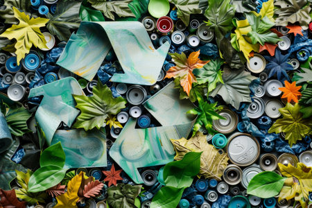 Recycling Sign Made of Leaves and Tin Cans, Incorporate elements of nature to symbolize the interconnectedness of recycling and the environment