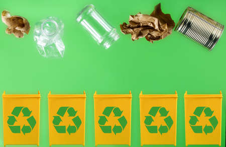 Throwing paper, metal, glass, plastic, organic garbage into different yellow containers on a light green background. Waste separation and recycling concept