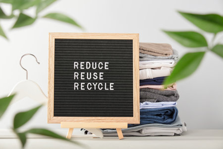 Black letter box and stack of folded clothes, reduce,reuse,recycle quote
