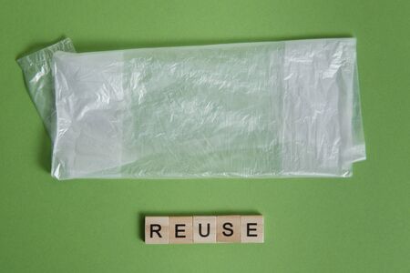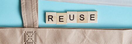 Word reusable made from wooden cubes, green leaves and green metal heart on background, horizontal