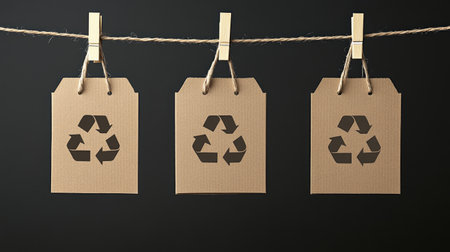 A cardboard tag featuring a recycling symbol dangles from a clothesline in a fashion studio, emphasizing eco-friendly practices in the clothing industry.