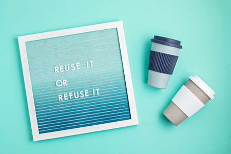 Reusable coffee cup and letterboard with text reuse it or refuse it. Zero waste sustainable lifestyle. Eco friendly habbits for take away coffee