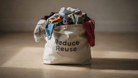Canvas Bag Overflowing With Kids Clothes, Volunteer Packing Donation For Community Drive, Moody LowKey Lighting, Worn Wooden Floor, Visible Reduce Reuse Print, Mixed Colorful Garments,