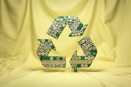 A three-arrow recycling symbol crafted from floral patterned fabric stands prominently against a softly draped yellow textile.