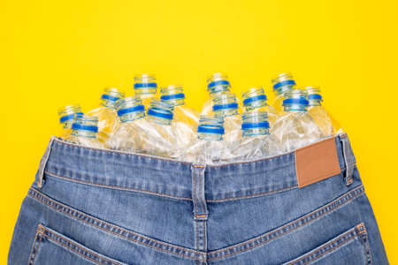 Recycle technology of plastic bottle to make clothes. Top view old water bottle and blue short jeans on yellow background