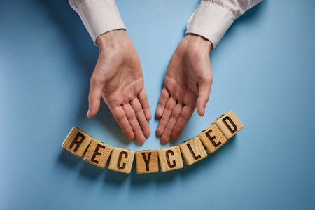 recycled word written on a wooden block. blue background