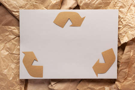 Recycle symbol at stack of recycled paper as background texture. Recycling idea concept and brown paper
