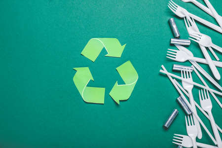 Plastic forks, straws and batteries on color background. Recycling concept