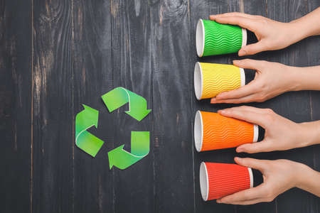 Hands with used cups on dark wooden background. Concept of recycling
