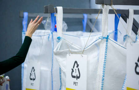 Sorting recyclables. Volunteer eco-activist sort polyethylene Terephthalate (PET) plastic bottles by color to a containers with the appropriate marking.