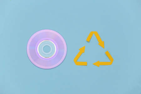 Recycled arrows sign and CD disk on blue background. top view