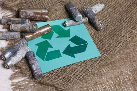 Corroded used batteries. Nearby is a recycling sign and linen. Close-up shot.