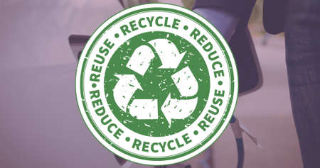 reduce reuse recycle sign in front of backyard bokeh, concept of sustainability and circular economy