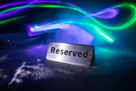 Reserved sign on the table. A tag of reservation placed on the wood table. Metal tag with reservation on dark. Reserved table in a restaurant. Creative concept with colorful lights. Selective focus