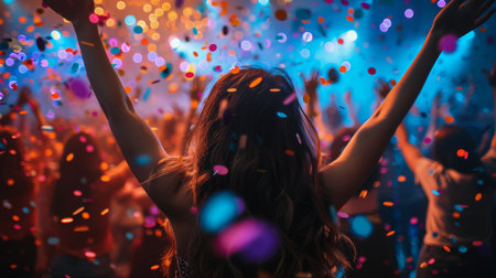A lively dance party takes place in a club filled with colorful confetti flying through the air. People dance joyfully under bright lights on a Saturday night.