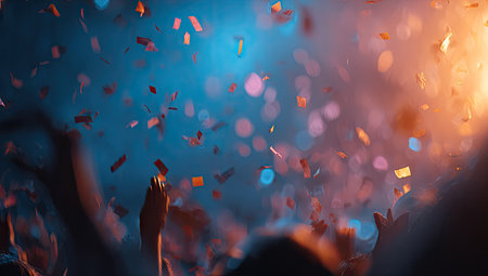 Vibrant image of confetti raining down on a cheering crowd at a lively event, bathed in colorful stage lights. The focus is on the confetti and the glow, creating a lively atmosphere. Silhouettes of people are visible, suggesting a large group, and are raised in excitement.