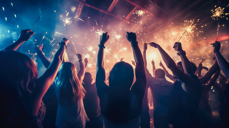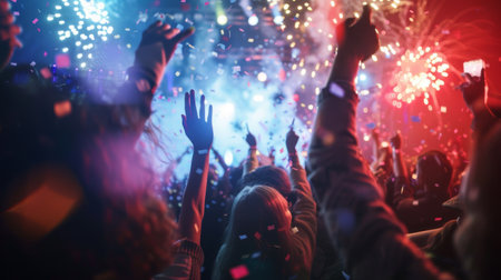 Unfocused image of a joyful crowd with raised hands enjoying a night celebration with colorful fireworks and confetti.