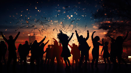 A diverse group of people are seen celebrating outdoors with confetti in the air. The composition features a crowd bathed in warm, golden light during a sunset. The image displays a festive atmosphere with implied happiness. It could be used in promotional materials or to illustrate concepts of celebration and community.