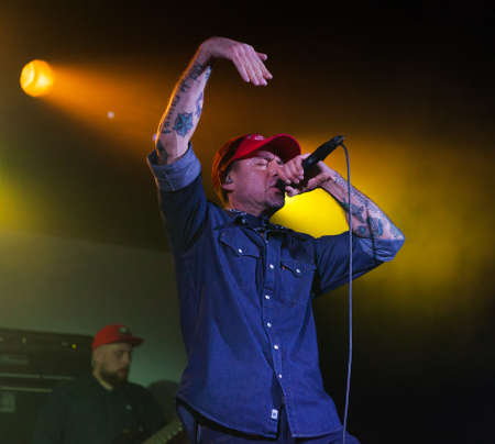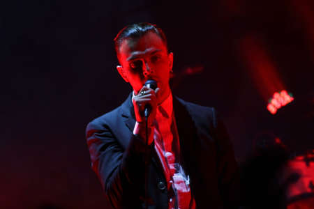MOSCOW, RUSSIA - JULE 06, 2012: Vocalist Alexei Serov performs at a concert of the Disco Accident music band.