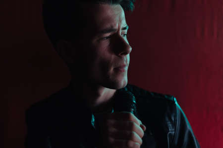 Close up portrait Rock band vocalist singing to microphone in lights on red background