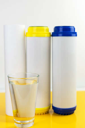 water filters. Carbon cartridges and a glass on a white background. household filtration system