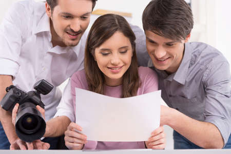 Asian photographer allow model to view pictures taken on the camera screen. The young model is very satisfied with her photo. The atmosphere in the photo studio.