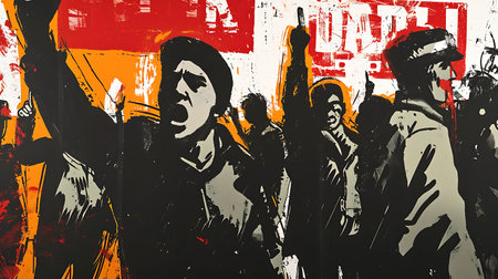 Silhouetted figures of protesters raise their arms and display banners against a vibrant abstract backdrop, symbolizing unity and activism in the crowd.