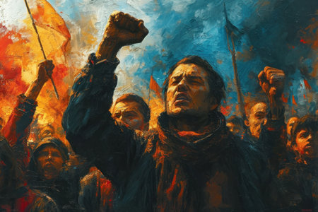 Young and older revolutionaries unite in urban protest for social change amid flickering flames