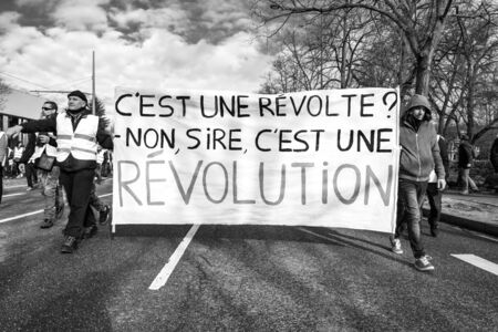 STRASBOURG, FRANCE - FEB 02, 2018: People marching during protest of Gilets Jaunes Yellow Vest manifestation anti-government demonstrations with this is a revolution placard