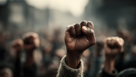 Hand of African American individual raised in defiance at a protest, surrounded by a blurred crowd, representing unity, strength, and social justice