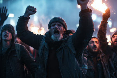 Young and older revolutionaries unite in urban protest for social change amid flickering flames
