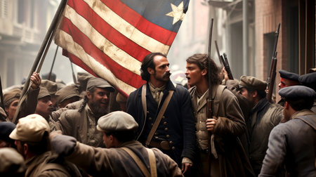 Revolutionary Leader, Torn Flag, Determination in his Eyes, Leading a Protest, Evening Sunset, Realistic Image, Silhouette Lighting, Tilted angle vie