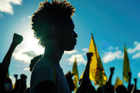 Silhouette of a young man with raised fist stands out in the crowd of protesters with yellow flags, illuminated by bright sun, evoking solidarity.