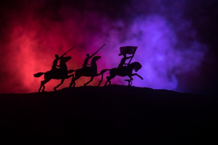 Battle scene. Military silhouettes fighting scene on war fog sky background. World War Soldiers Silhouettes Below Cloudy Skyline At sunset. Artwork Decoration. Selective focus