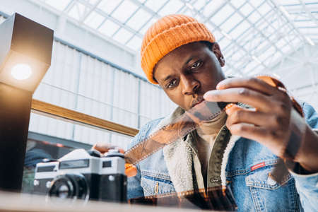 Selfie portrait, happy African woman with curly hair, in a light jacket, makes a selfie, holds in her hand a vintage, retro camera for photographing, a photo on a colored blue background.